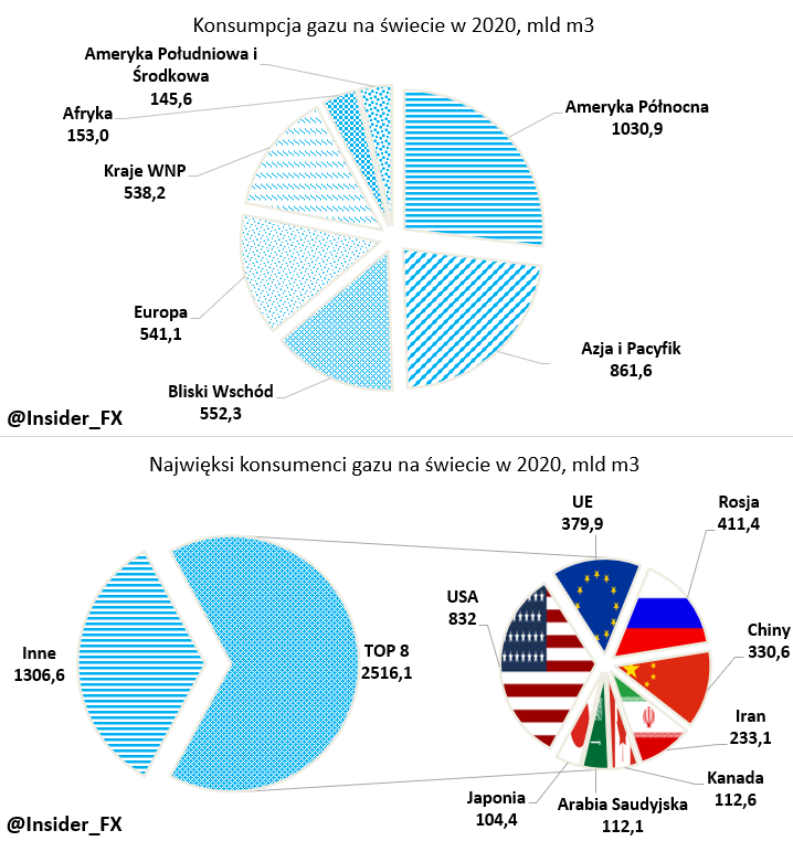 W zestawieniu rzuca się również w oczy duże zapotrzebowanie na gaz ze strony Chin, zwłaszcza w obliczu relatywnie niższej produkcji surowca. Istotne zapotrzebowanie na gaz przy niewielkiej produkcji krajowej ma także Japonia, która w 2020 roku skonsumowała ponad 104 mld m3. Niemniej jednak w żadnym z tych państw dysproporcja między produkcją a konsumpcją nie jest tak duża jak w przypadku UE.