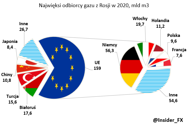 W 2020 roku UE odebrała aż 2/3 rosyjskiego eksportu gazu. Z tego bezkonkurencyjnym liderem były Niemcy, zakupując ponad 56 mld m3. Znacznym odbiorcą były również Włochy z importem zbliżonym do 20 mld m3. Polska niestety należy do państw o największym uzależnieniu od rosyjskiego gazu, którego w 2020 roku zakupiła 9,6 mld m3. Stanowiło to wówczas 4% rosyjskiej sprzedaży surowca.
