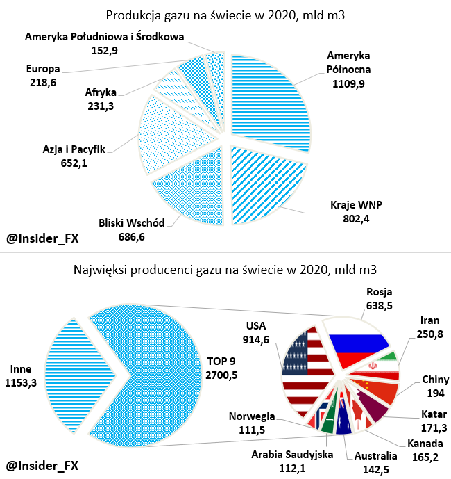 Pod względem produkcji gazu bezkonkurencyjnym liderem pozostaje Ameryka Północna, wszystkim Stany Zjednoczone. W 2020 roku USA odpowiadały za blisko 25% globalnej produkcji gazu, która sięgnęła ponad 3850 mld m3. W samej Ameryce Północnej znaczącym graczem jest także Kanada z produkcją przekraczającą 165 mld m3. Na drugim miejscu pod względem produkcji są kraje WNP (Wspólnota Niepodległych Państw), gdzie pierwsze skrzypce gra właśnie Federacja Rosyjska. Dalej znajdziemy kraje Bliskiego Wschodu z liderem w postaci Iranu oraz Azję i Pacyfik, gdzie największym producentem są Chiny. Warto nadmienić, że do produkcji gazu w tym rozumieniu zaliczamy także gaz wykorzystywany do transformacji gazu do postaci skroplonej.
