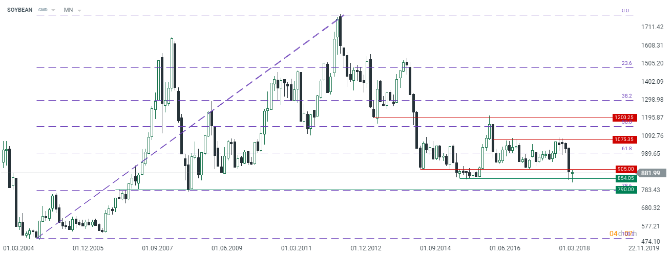 Lipiec powoli chyli się ku końcowi, warto więc rzucić okiem na wykres miesięczny. Obecnie wygląda na to, że strona popytowa może wybronić silną strefę w okolicy 850 USD, niemniej na mocniejsze odbicie nie powinniśmy liczyć z uwagi na wyraźny opór tuż nad 900 USD. Tak czy inaczej, podobny do aktualnego kształt świeczki na koniec miesiąca może zwiastować lepsze nastroje w dalszej części roku. Rynek soi pozostaje wciąż bardzo atrakcyjny biorąc pod uwagę bieżącą cenę, jednakże, by ujrzeć mocniejsze wzrosty, zmianie musi ulec szersza perspektywa vide relacja Waszyngton – Pekin.