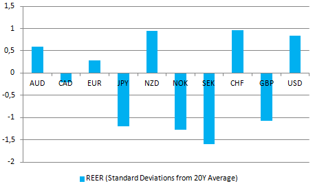 Wycena walut G10 na podstawie koncepcji REER obrazującej odchylenia standardowe od 20-letniej średniej, źródło: BIS, InsiderFX Research