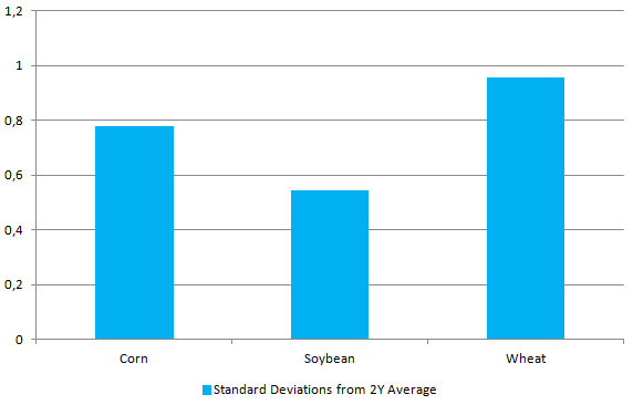 Tymczasem dane odnośnie do pozycjonowania spekulacyjnego wskazują, że soja jest obecnie najmniej przewartościowanym rynkiem na tle pozostałych zbóż, bazując na ilości odchyleń standardowych od 2-letniej średniej. Tym samym można podejrzewać, że w przypadku większej korekty notowania soi mogą ucierpieć najmniej z racji redukcji pozycji długich. To w połączeniu z ujemnie nachyloną krzywą terminową sprawia, że łączna stopa zwrotu z pozycji długiej na rynku soi może być wyższa aniżeli w przypadku pszenicy czy kukurydzy. Można również przypuszczać, że ryzyka związane z wprowadzeniem ceł na import amerykańskiej soi przez Chiny są póki co dość ograniczone (obecnie większe znaczenie ma soja pochodząca z Brazylii).