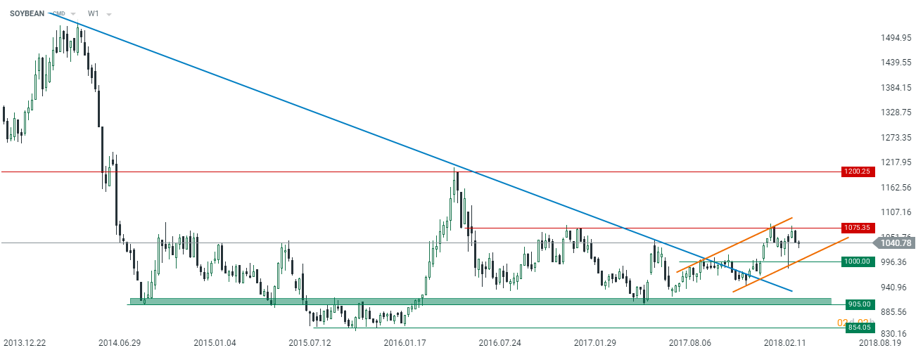 Po mocnej, ale jednocześnie krótkoterminowej korekcie napędzanej przez implementację ceł na import surowca z USA przez Chiny, notowania soi powróciły do wcześniejszych poziomów cenowych. Choć nie udało się przełamać kluczowego oporu w postaci 1075$ to wydaje się, że sztuka ta może się powieść w kolejnych tygodniach. Niemniej jednak obecnie nie można wykluczać zejścia w rejon dolnego ograniczenia kanału trendowego, który to ruch może być dobrą okazją do rozważenia pozycji długiej.