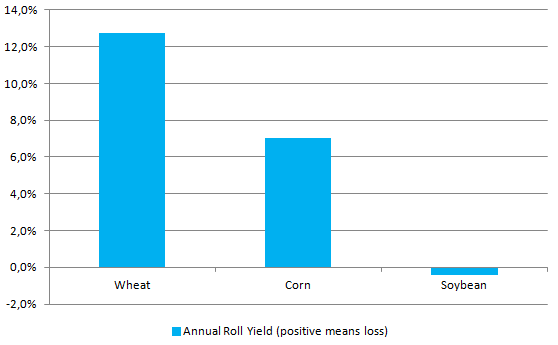 Spoglądając obecnie na rynku surowców rolnych można zauważyć, że backwardation widoczne jest jedynie w przypadku soi, na pozostałych dwóch zbożach mamy do czynienia z klasycznym contango. Implikuje to, że otwierając obecnie pozycję długą na pszenicy lub kukurydzy po cenie spot (tj. najbliższy kontrakt) w horyzoncie kolejnego roku obydwa zboża musiałyby wzrosnąć o odpowiednio 12,7% oraz 7%, by zrekompensować stratę z tytułu rolowania kontraktów. Inaczej sytuacja ma się na soi, gdzie odwrócona krzywa terminowa sprawia, że w perspektywie roku nastąpi zysk z tytułu rolowania, choć skromny i sięgający jedynie 0,4%. Dla porównania warto zauważyć, że od początku roku ceny pszenicy wzrosły o 7,8%, kukurydzy o 6,9% zaś soi o 5,6% (spot), choć na pozór wydaje się oczywistym, że soja była najsłabszą inwestycją, to po skorygowaniu o roll yield okazuje się, że było dokładnie odwrotnie. Przy założeniu otwierania pozycji długich pierwszego dnia handlowego roku stopa zwrotu po tymże uwzględnieniu dla soi wynosiłaby wciąż 5,6%, dla kukurydzy 4,7%, zaś dla pszenicy 5%. Uwypukla to jak duże znaczenie ma krzywa terminowa dla inwestycji na rynku surowcowym (pomijając już kwestię związaną z tym co sprawia, że krzywa ma taki, a nie inny kształt).