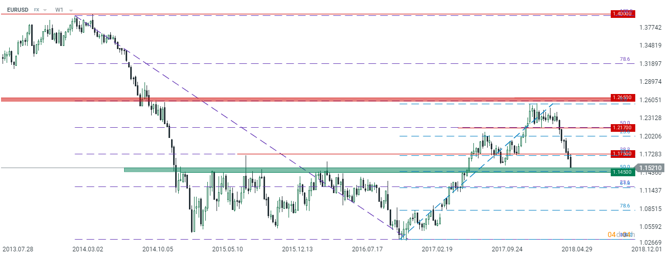 Nawiązując do ostatniego researchu odnośnie do kursu wspólnej waluty i sytuacji politycznej na południu Europy w dalszym ciągu podtrzymuję swój pogląd, iż krytyczne wsparcie na EURUSD wypada w okolicy 1,1450. Pułap ten stanowi również połowę wzrostowego ruchu zapoczątkowanego w styczniu 2017 roku, stąd też sądzę, że może on stanowić punkt zwrotny w całym trendzie o ile tylko ryzyka polityczne na południu nieco opadną, zaś czerwcowe posiedzenie EBC przybliży nas do planu wygaszenia programu skupu obligacji wraz z końcem 2018 roku. Zwrot na EURUSD powinien również wspomóc polskiego złotego, gdzie w kolejnych tygodniach możliwa jest korekta wzrostowa.