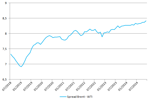 Rosnąca amerykańska produkcja ropy jest jednym z głównych argumentów za rosnącym spreadem między gatunkiem Brent i WTI. Sytuacja ta ma miejsce nie tylko na rynku spot, ale i również na rynku terminowym, czego dowodzi wykres poniżej. Podczas gdy ostatni rozwój wydarzeń na Bliskim Wschodzie (odejście USA z paktu nuklearnego) był niewątpliwie pozytywny dla cen czarnego złota, na co wskazywałem w zeszłym tygodniu, to gatunek europejski skorzystał na tym czynniku zdecydowanie mocniej. W rezultacie spread w transakcjach spot rozszerzył się już wyraźnie powyżej 7$, co z kolei dalej powinno sprzyjać eksportowi amerykańskiej ropy.