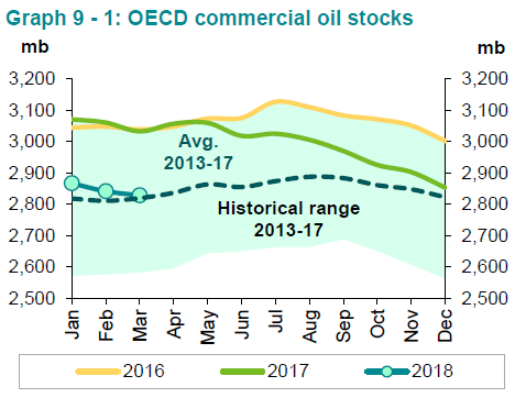 Zacznijmy jednak od analizy wczorajszego raportu kartelu OPEC. To, co najbardziej uderza to fakt, że zapasy w krajach OECD po marcu skurczyły się o 12,7 mb w ujęciu miesięcznym i obecnie znajdują się tylko 9 mb powyżej 5-letniej średniej. Z prostej ekstrapolacji można podejrzewać, że cel został osiągnięty już po kwietniu, niemniej za oficjalnym potwierdzeniem tejże informacji przyjdzie nam poczekać jeszcze cztery tygodnie. Co godne uwagi to fakt, że marcowy spadek sterowany był wyłącznie przez kraje z obydwu Ameryk, gdzie poziom zapasów spadł łącznie o 24,5 mb. W przypadku Europy, Azji i Pacyfiku odnotowano wzrost zapasów o blisko 12 mb. Dane te potwierdzają, że eksport amerykańskiej ropy w kierunku Europy pozostaje bardzo solidny i mimo rosnącej produkcji czarnego złota z łupków poziom zapasów spada (choć w samych Stanach Zjednoczonych w kwietniu zanotowano niewielki wzrost zapasów, po raz pierwszy od 11 miesięcy). Dodajmy również, że nowe kalkulacje OPEC ukazały wyższy niż wcześniej wskazywano wzrosty światowego popytu, niemniej perspektywa dla strony podażowej została również podwyższona.