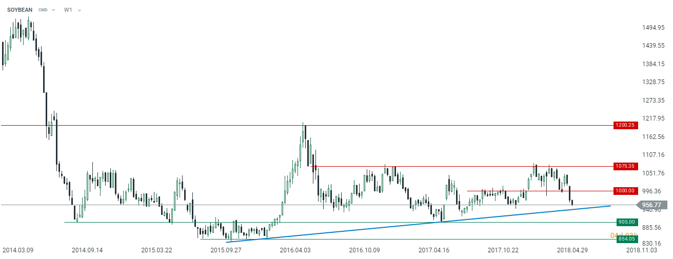 Sytuacja na wykresie soi stała się w ostatnim czasie mniej sprzyjająca stronie popytowej, niemniej jednak mając na uwadze względnie solidne fundamenty oraz rosnące ceny pozostałych zbóż wydaje się, że nie ma już większej przestrzeni do spadków. Tym samym w moim przekonaniu poziom 900$ za 100 buszli może okazać się wszystkim na co stać sprzedających. Już z obecnych poziomów cenowych ryzyka zdają się przemawiać za odwróceniem trwającego cofnięcia.