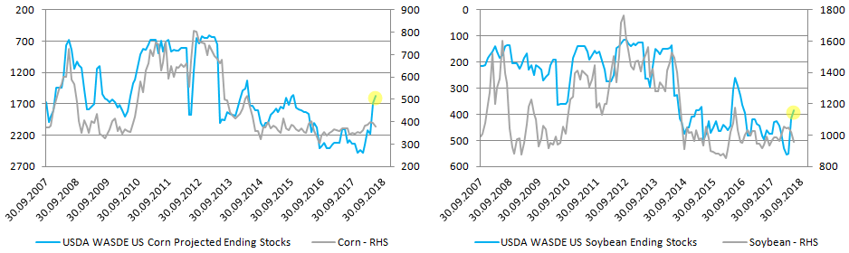Na początku warto wskazać, że począwszy od zeszłego miesiąca otrzymujemy nowe prognozy dla sezonu 2018/2019. Poniższa tabela przedstawia najważniejsze szacunki z czerwcowego raportu i już pobieżny rzut oka pozwala zauważyć, że odczyt ten był z fundamentalnego punktu widzenia najbardziej korzystny dla kukurydzy oraz soi. W obydwu przypadkach otrzymaliśmy obniżenie szacowanego pułapu łącznej podaży, lekkie zwiększenie estymacji odnośnie do spożycia oraz przede wszystkim zdecydowanie niższe zapasy na koniec sezonu. Zauważmy, że to właśnie ta wielkość jest najbardziej skorelowana z ceną rynkową ziarna (na bazie danych końca 2007 roku zależność ta jest najwyższa w przypadku kukurydzy – współczynnik R2 – 64%, dla pszenicy 49%, dla soi 45%). Nieco słabsze liczby otrzymaliśmy dla pszenicy, gdzie prognozuje się minimalnie wyższą rentowność upraw, wyższą produkcję i łączną podaż. Zauważmy, że w ostatnim czasie susze w USA, Australii czy Kanadzie przyczyniły się do obniżenia globalnej prognozy produkcji z 747,8 mln ton w maju do 744,7 obecnie, aczkolwiek dla samych Stanów Zjednoczonych czynnik ten był niewystarczający by negatywnie wpłynąć na szacowany poziom zbiorów.