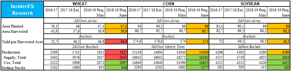 Pierwsze dni miesiąca to nie tylko raport z amerykańskiego rynku pracy, ale również publikacja amerykańskiego Departamentu Rolnictwa (USDA) odnośnie do prognozowanych poziomów produkcji, zapasów, wydajności upraw kluczowych zbóż. Czerwcowy raport wypadł względnie pozytywnie pokazując mniejsze, szacowane zapasy dla każdego z analizowanych zbóż: pszenica, kukurydza i soja. Z kolei biorąc pod uwagę również trendy z poprzednich miesięcy okazuje się, że to dwa ostatnie ziarna wydają się mieć największy potencjał do zwyżek w najbliższym czasie. Prognoza ta jest oczywiście obarczona ryzykiem sezonowości, gdyż z reguły w okresie wakacyjnym ceny zbóż spadają. Niemniej najsłabiej pod tym względem wypada kukurydza, z kolei ostatnie trzy miesiące roku były w ciągu ostatnich 5 lat sprzyjające wszystkim trzem gatunkom.