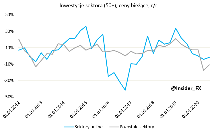 Innym aspektem jest również fakt, że cięcia inwestycji na maszyny czy środki transportu można dokonać relatywnie szybko w porównaniu do nakładów na przedsięwzięcia budowlane. Proces inwestycyjny w sektorze budowlanym trwa pewien czas, zaś inwestycja w nową maszynę czy pojazd polega na kupnie i przygotowaniu do użytkowania (znacznie krótszy czas). Poza tym istotny wpływ na tę odporność mógł mieć sektor publiczny, finansujący między innymi obiekty inżynierii wodnej i lądowej, które bardzo często w sposób znaczący korzystają ze wsparcia unijnego. Widać to również po analizie inwestycji sektora 50+, gdzie za spadek w drugim i trzecim kwartale odpowiadały przede wszystkim sektory, które nie wykorzystują istotnie środków unijnych. Innymi słowy absorbcja środków z kończącej się perspektywy budżetowej 2014-2020 trwa w najlepsze.