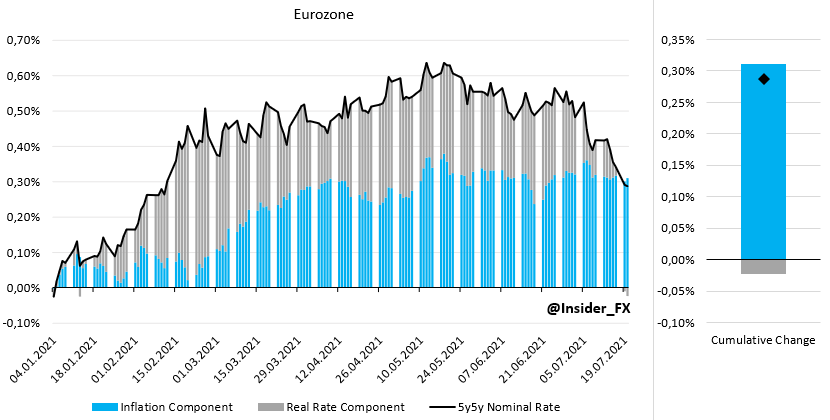 Obawy uczestników rynku skupiają się również na potencjalnym scenariuszu stagflacji, tj. wysokiej inflacji i niemrawego wzrostu gospodarczego. W moim przekonaniu obawy te są jednak przesadzone, gdyż jeśli czynniki jednorazowe związane z otwieraniem gospodarki przestaną istotnie podbijać wzrost PKB, to z dużym prawdopodobieństwem komponent ten ograniczy również swój wkład w inflację. Tym samym spadkowi ulec powinna zarówno dynamika wzrostu gospodarczego jak i cen, choć ryzykiem tutaj jest wpływ utrzymujących się ograniczeń po stronie podażowej. W tym miejscu nadmienię, że ograniczenie inflacji i przynajmniej częściowo materializacja retoryki banków centralnych dotycząca przejściowego wzrostu cen, powinna być raczej korzystna dla perspektyw wzrostu. Inflacja pozostanie w takim wypadku w okolicy akceptowalnych pasm wahań głównych banków centralnych, które jednocześnie będę mogły bardzo stopniowo normalizować politykę pieniężną. W takim środowisku obawy uczestników rynku o scenariusz stagflacyjny powinny opaść (o ile kłopoty podażowe nie ulegną pogorszeniu), a realne stopy procentowe powinny ponownie zacząć rosnąć, odzwierciedlając w dalszym ciągu obiecujące perspektywy wzrostu gospodarczego. Tymczasem 5-letnia stopa forward za 5 lat w strefie euro wymazała już całe tegoroczne wzrosty, sugerując wzrost obaw dotyczących kontynuacji silnego post-pandemicznego wzrostu.