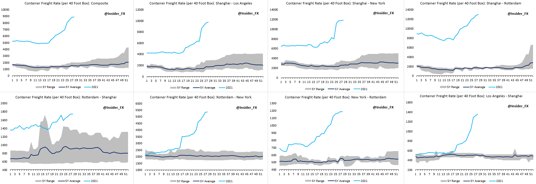 Przechodząc jednak do clou tematu wydaje się, że materializacja retoryki banków centralnych w kwestii przejściowości inflacji pomogłaby wesprzeć wiarę w kontynuację ożywienia gospodarczego. Retoryka ta argumentowana jest tym, że ostatni zryw dynamiki wzrostu cen na świecie wynika z komponentów odpowiedzialnych za otwieranie życia gospodarczego po miesiącach obostrzeń pandemicznych oraz komponentów związanych z szeroko rozumianymi problemami podażowymi (inflacja podażowa, z którą z definicji polityka pieniężna walczyć nie powinna). O ile część podwyższonych cen związana z otwieraniem gospodarki (głównie usługi) może faktycznie niebawem zacząć wygasać, o tyle problemy po stronie podażowej mogą zostać z nami znacznie dłużej. Mówimy tutaj o trudnościach w transporcie w wyniku niedoboru kontenerów i silnego popytu, co objawia się bardzo wysokimi stawkami frachtowymi. Wymienić należy również niedobory półprzewodników, drewna budowlanego czy stali. Kwestia półprzewodników dotyka przede wszystkim przemysł motoryzacyjny, do którego dostawy w trakcie pandemii zostały mocno ucięte celem zwiększenia dostaw do innych branż jak choćby IT. Z kolei wzrost popytu na drewno budowlane czy stal to efekt boomu budowlanego nie tylko w USA, ale również w Chinach, który to kraj zwiększał w ostatnim czasie wyraźnie import drewna.