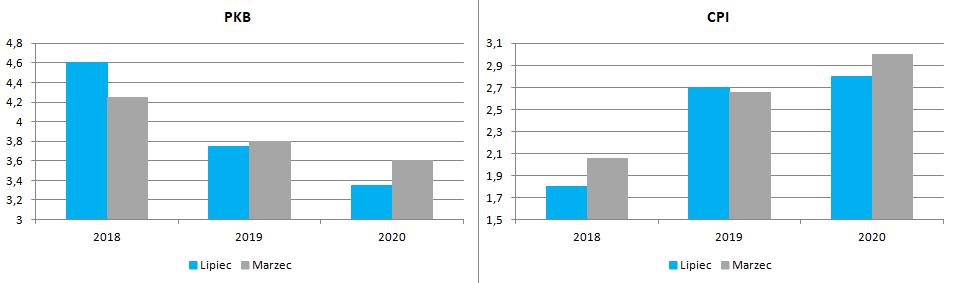 Zanim przejdziemy do prezentacji zaktualizowanych prognoz makroekonomicznych warto poświęcić chwilę samej konferencji prasowej, na której to prezes Adam Glapiński stwierdził, że w jego osobistym przekonaniu podwyżka stóp procentowych może nie być konieczna nawet do końca 2020 roku. Jeszcze ostatnio jego retoryka wyglądała zgoła inaczej i sugerowała brak zmian w przyszłym roku i możliwe ruchy w roku kolejnym. Z punktu widzenia gospodarczego, nowe projekcje uwypuklają wręcz idylliczną perspektywę dla Polski wskazując na wciąż ograniczoną presję inflacyjną oraz przyzwoity wzrost gospodarczy. Zdaniem prezesa NBP ostatnia deprecjacja złotego nie miała większego wpływu na sferę realnej gospodarki, podobnie z resztą jak poprzednia, solidna aprecjacja. Glapiński podkreślał, iż fundamenty polskiej gospodarki są bardzo stabilne, a ruchy na polskiej walucie są w dużej mierze podyktowany faktem, iż jest ona klasyfikowana wśród walut rynków wschodzących jak choćby węgierski forint, rumuński lej czy czeska korona. Tym samym to bardziej globalne nastroje, a nie wewnętrzne aspekty, sterują polską walutą – trudno się z tym nie zgodzić.