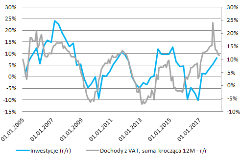 Dochody z tytułu VAT oraz dynamika inwestycji, źródło: MF, GUS, InsiderFX Research