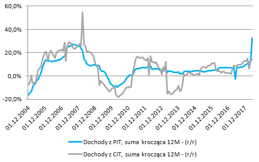 Dochody z tytułu PIT i CIT, źródło: MF, InsiderFX Research