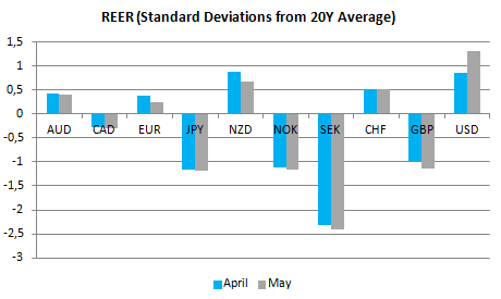 Generalnie członkowie BoE zgodzili się, że zastój na rynku pracy zanika (tożsame komentarze padły z ust Carney’a podczas ostatniej konferencji prasowej), co powinno gwarantować stopniowe podwyżki stóp. Z drugiej strony członkowie optujący za podniesieniem kosztu pieniądza argumentowali to zarysowującym się ryzykiem w postaci zwiększonej presji płacowej, co w mojej opinii jest uzasadnione na obecnym etapie cyklu koniunkturalnego. Ogólnie rzecz biorąc jeszcze przed dzisiejszym posiedzeniem sierpniowa podwyżka była mało realna, teraz jej prawdopodobieństwo wzrosło do około 65-70% wskazując, iż ruch ten jest całkiem prawdopodobny. Mając na uwadze fakt, że zarówno NOK jak i GBP pozostają jednymi z mocniej niedowartościowanych walut G10 (na podstawie koncepcji REER jw.) wydaje się, że zamiana postawy banków centralnych może zaowocować umocnieniem lokalnych walut. Zauważmy również, że w maju spadła wycena niemalże wszystkich walut z wyjątkiem amerykańskiego dolara, co było oczywiście związane z jego szeroką aprecjacją.