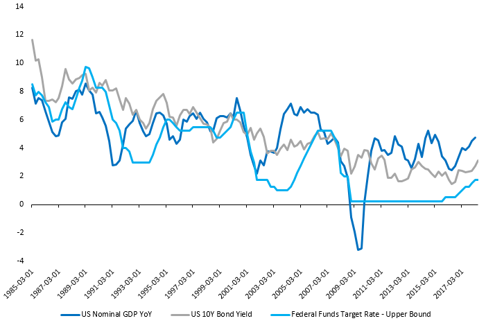 Za dalszym wypłaszczaniem się krzywej będzie w mojej opinii przemawiała również ograniczona przestrzeń do odbicia premii terminowej, czyli innymi słowy nadwyżki wbudowanej w bardziej długoterminową obligację w opozycji do tego, co można by uzyskać inwestując w krótkoterminowy papier na ten sam okres reinwestując środki. Wśród powodów takiego stanu rzeczy według mnie będzie bardzo powolne obniżanie sumy bilansowej przez FED, w efekcie czego możemy raczej zapomnieć o zejściu do poziomów sprzed kryzysu. Czy jednak amerykańska gospodarka lada moment popadnie w kłopoty tylko z uwagi na fakt trwałego przekroczenia magicznych 3%? Nie wydaje mi się, a sytuacja ta powinna być dobra tak długo, jak nominalna dynamika PKB pozostanie wyższa aniżeli koszt finansowania. Historycznie często bywało tak, że dopiero niższa od rentowności dynamika wzrostu gospodarczego w ujęciu nominalnym prowadziła do spowolnienia gospodarczego (nadmierny wzrost stóp procentowych). Aczkolwiek aktualnie swego rodzaju kanarkiem może okazać się stopień zadłużenia amerykańskich firm, które na potęgę korzystały z dźwigni finansowej w ostatnich latach, mocno zwiększając swoje zadłużenie. W efekcie tego wrażliwość na wzrosty stóp mogła wzrosnąć, niemniej jednak z dużym prawdopodobieństwem można stwierdzić, że póki co nie ma powodów do obaw.