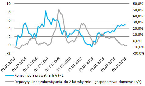 Na koniec odnieśmy się do dzisiejszych danych NBP w kwestii podaży pieniądza (wzrost bazy M3 powyżej oczekiwań), które potwierdzają ograniczoną przestrzeń dla dalszego wzrostu dynamiki konsumpcji. W marcu dynamika depozytów do 2 lat ze strony gospodarstw domowych ponownie spadła, tym razem o 7,1% rok do roku. Dane te wpisują się w perspektywę niskiej stopy oszczędności, która naturalnie jest czynnikiem ograniczającym dalszą ekspansję konsumpcji. W przypadku pojawienia się wzmożonego zainteresowania depozytami wówczas dynamika konsumpcji najpewniej zacznie spowalniać, wpisując się w ogólne spowolnienie w horyzoncie kolejnych dwóch lat. Niemniej na ten moment brak jastrzębiej retoryki RPP skutecznie hamuje wzrost rentowności obligacji krajowych (krótki koniec jest dodatkowo hamowany poprzez wzmożony popyt ze strony banków, które posiadając tego rodzaju papieru zwolnione są z płacenia podatku bankowego).