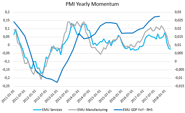 Wzrost gospodarczy w strefie euro prawdopodobnie spowolnił w pierwszym kwartale 2018, na co wskazują indeksy PMI, źródło: Markit, Bloomberg, InsiderFX Research